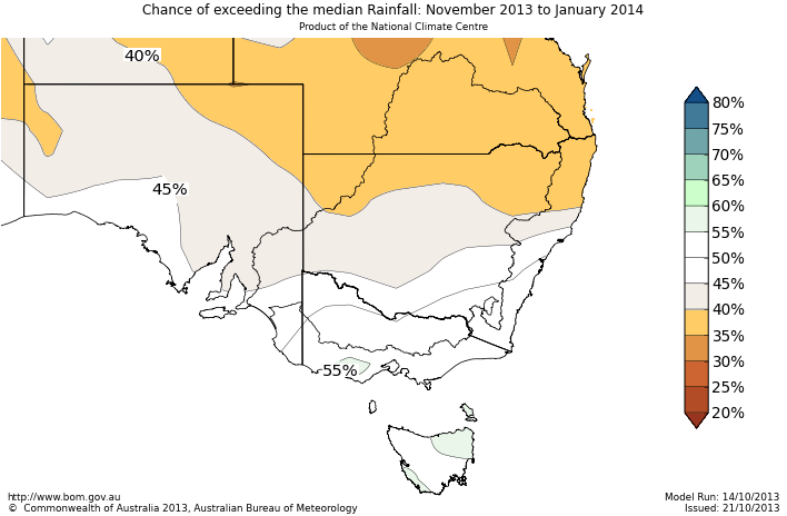 The chances of exceeding the median rainfall during November to January are 30 to 40% over northern NSW and northeast SA. In other words, the chances of below average rainfall are 60 to 70% over these areas. So, for every ten November to January outlooks with similar odds to these, about three or four of them would result in above-average rainfall over these areas, while about six or seven would be below average.