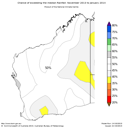 The chance of receiving a wetter or drier than normal November to January period is roughly equal (i.e. close to 50%) across most of WA.