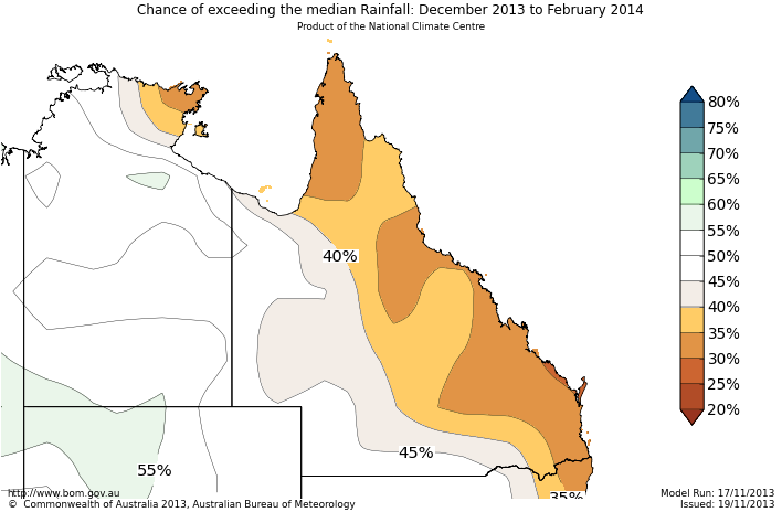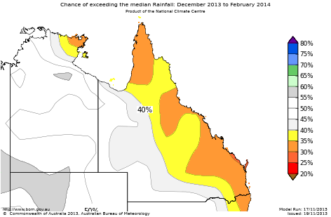 The chances of exceeding the median rainfall during December to February are 30 to 40% over eastern Queensland, and the eastern Top End of the NT. In other words, the chances of below average rainfall are 60 to 70% over these areas. So, for every ten December to February outlooks with similar odds to these, about three or four of them would result in above-average rainfall over these areas, while about six or seven would be below average.