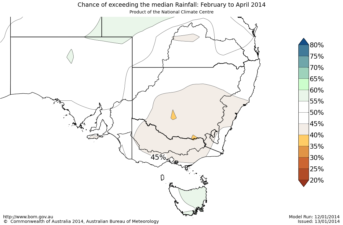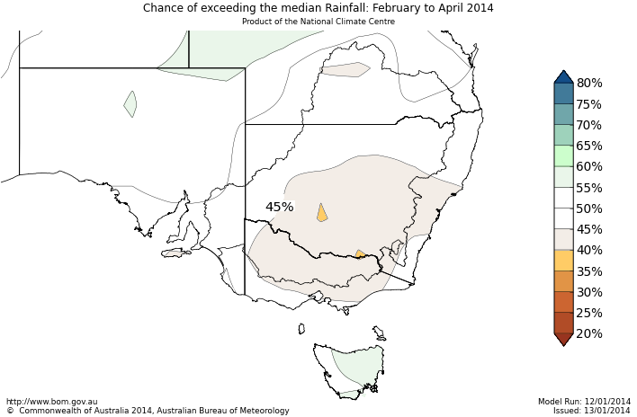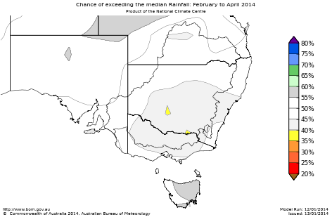 The chances of exceeding the median rainfall are between 40 and 60% over almost all of southeast Australia during the February to April period. This means there is not a strong tendency for either a wetter or drier February to April period for most of southeast Australia.
