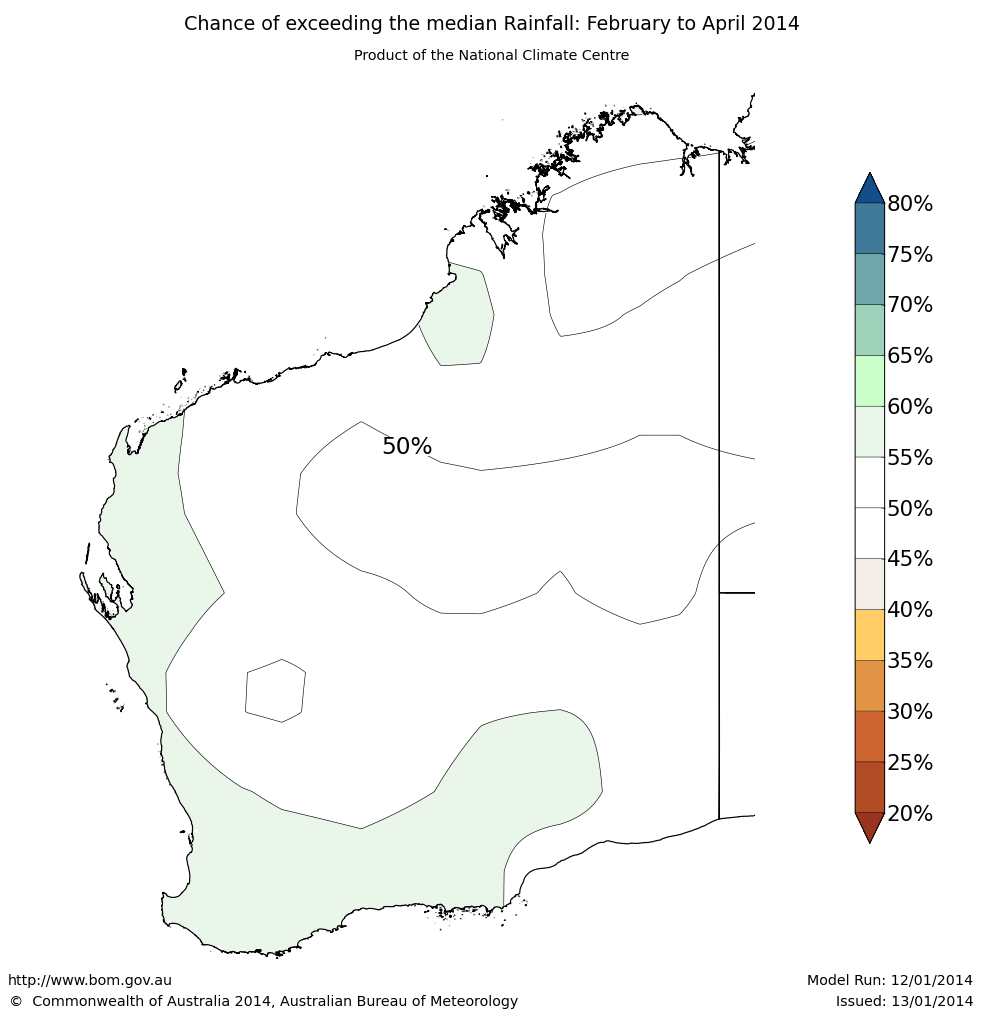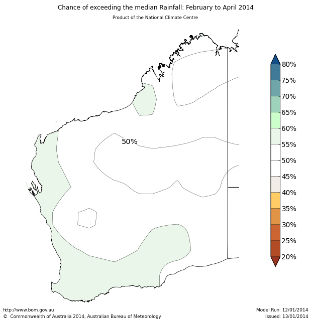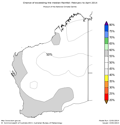 For the February to April period, the chances of exceeding median rainfall is between 45% and 60% over Western Australia. This means that there is not a strong tendency for either a wetter or drier February to April period for most locations.