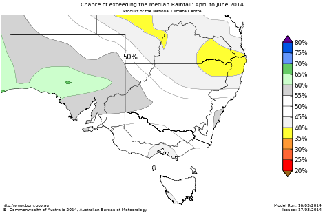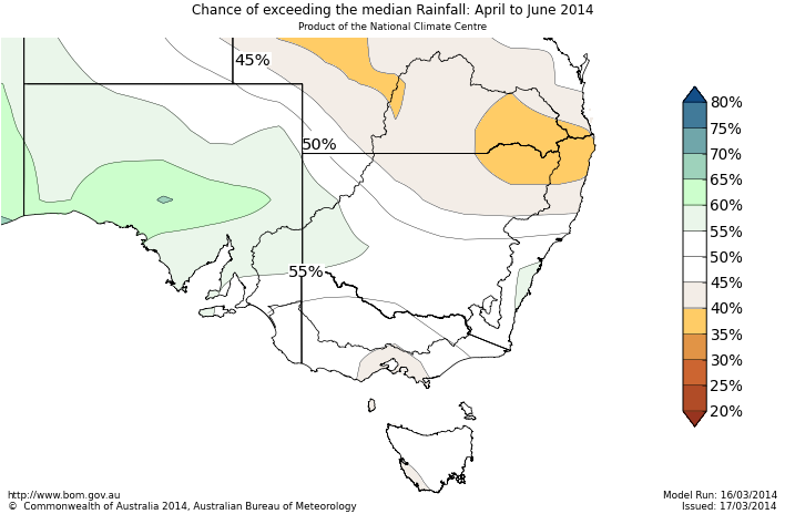 The chances of exceeding the median rainfall during April to June are 35 to 40% over parts of northeast NSW. In other words, the chances of below average rainfall are 60 to 65% over these areas. For every ten April to June outlooks with similar odds to these, about four of them would result in above-average rainfall over these areas, while about six would be below average.