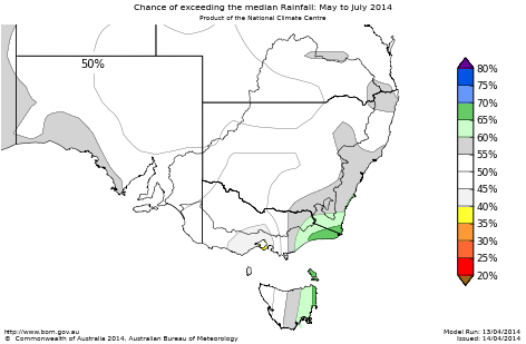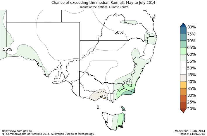 However, the chances of exceeding the median rainfall during May to July are greater than 60% over the East Gippsland area of Victoria and the South Coast of NSW. For every ten May to July outlooks with similar odds to these, about six or seven of them would result in above-average rainfall over these areas, while about three or four would be below average.