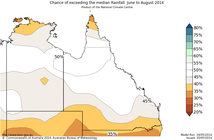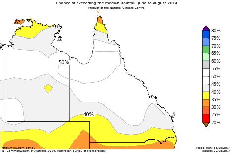 The chances of receiving above median rainfall for June to August are less than 40% over parts of southern Queensland and along small areas of the north coast. In other words, this means the chances of below median rainfall is greater than 60% in these areas. However, it should be noted that the median rainfall along the north coast during these dry season months ranges from 0 mm to 4 mm. For every ten winter outlooks with similar odds to these, about three or four of them would result in above-normal rainfall over these areas, while about six or seven would experience normal to below normal rainfall.