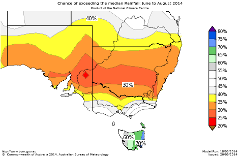 The chances of receiving above median rainfall for winter are less than 40% over most of SA, NSW and northern Victoria (see map above). Chances fall below 30% over eastern agricultural parts of SA, and southern NSW. In other words, this means the chances of below average rainfall is greater than 60% in these areas. For every ten winter outlooks with similar odds to these, about three or four of them would result in above-average rainfall over these areas, while about six or seven would be below average.