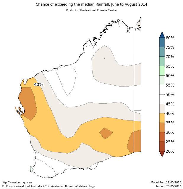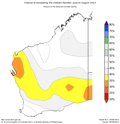 The chances of receiving above median rainfall for winter are 30 to 40% in the northwestern and southern parts of WA. In other words, the chances of below average rainfall are 60 to 70% in these areas. For every ten winter outlooks with similar odds to these, about six or seven winters would be below average, while only about three or four of them would result in above-average rainfall over these areas.