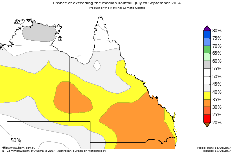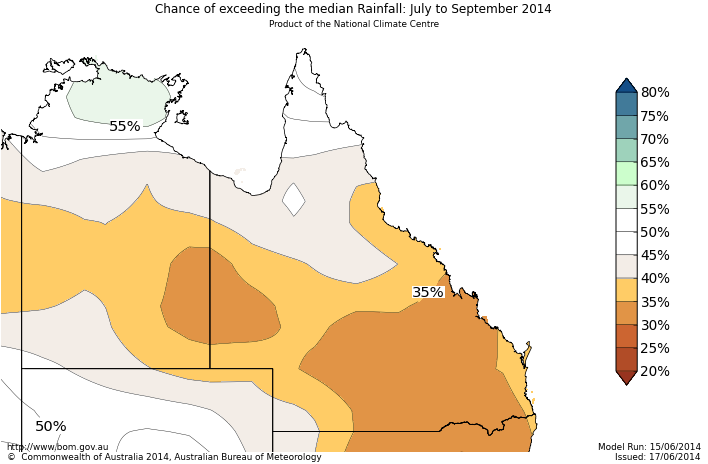 The chances of receiving above median rainfall for July to September are less than 40% over parts of the southern NT and the southern two-thirds of Queensland. In other words, this means the chances of below average rainfall is greater than 60% in these areas. For every ten July to September outlooks with similar odds to these, about three or four of them would result in above-average rainfall over these areas, while about six or seven would be below average.