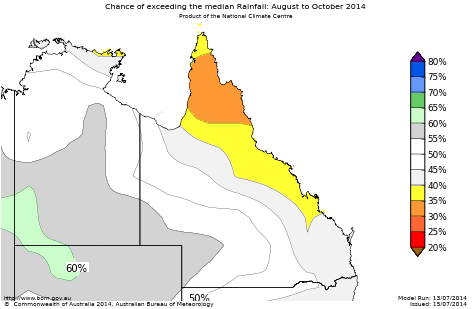 The chances of receiving above median rainfall for August to October are less than 40% over northern Queensland. In other words, this means the chances of below median rainfall is greater than 60% in these areas. For every ten August to October outlooks with similar odds to these, about three or four of them would result in above-average rainfall over these areas, while about six or seven would be below average.
