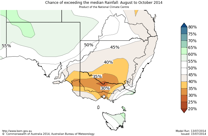 The chances of receiving above median rainfall for August to October are less than 40% over southern NSW, central and western parts of Victoria, and southeast SA. In other words, the chances of below median rainfall is greater than 60% in these areas. For every ten August to October periods with similar odds to these, at least six of them would have below-average rain.