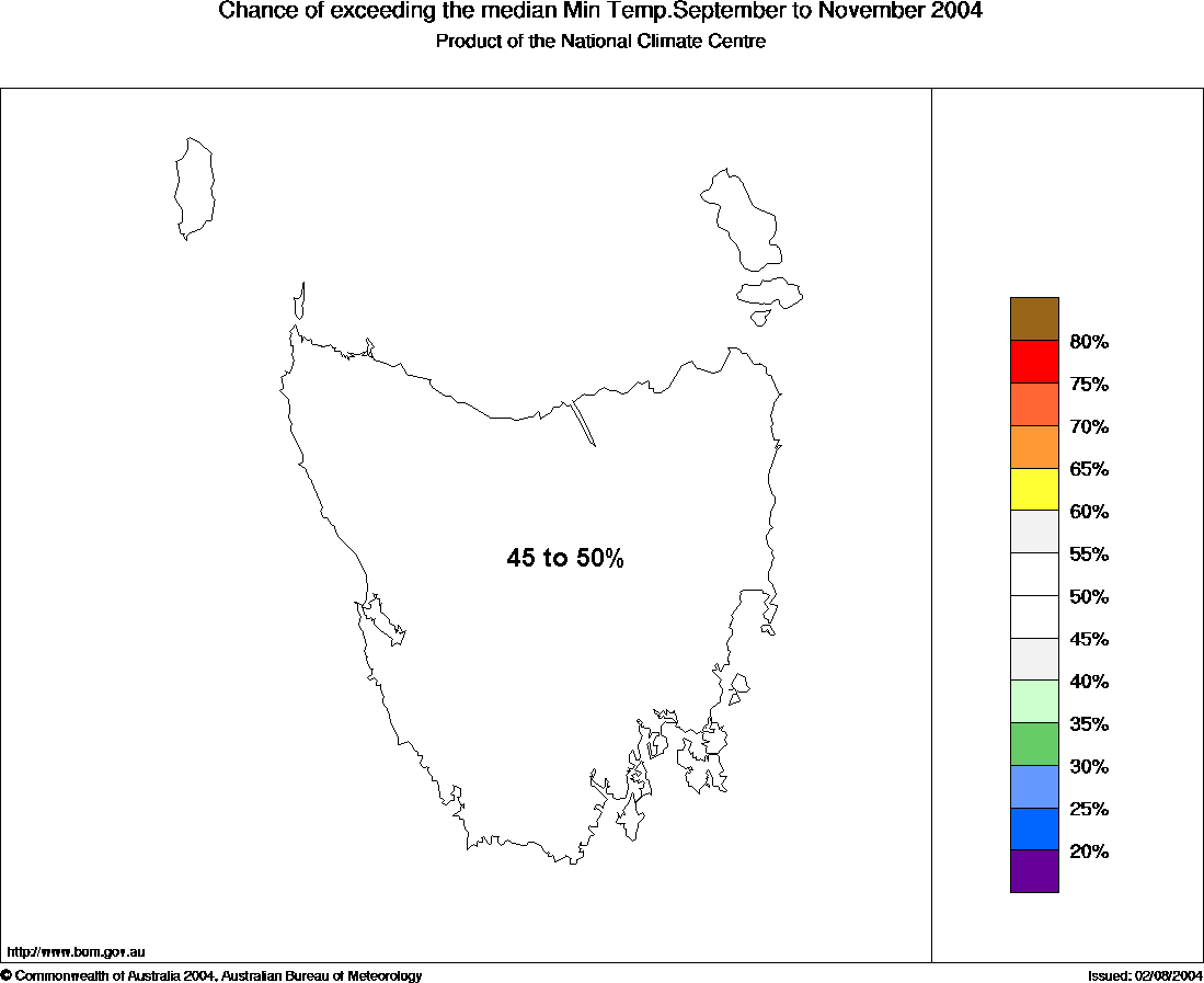 The chances of above normal daytime temperatures averaged over spring are between 50