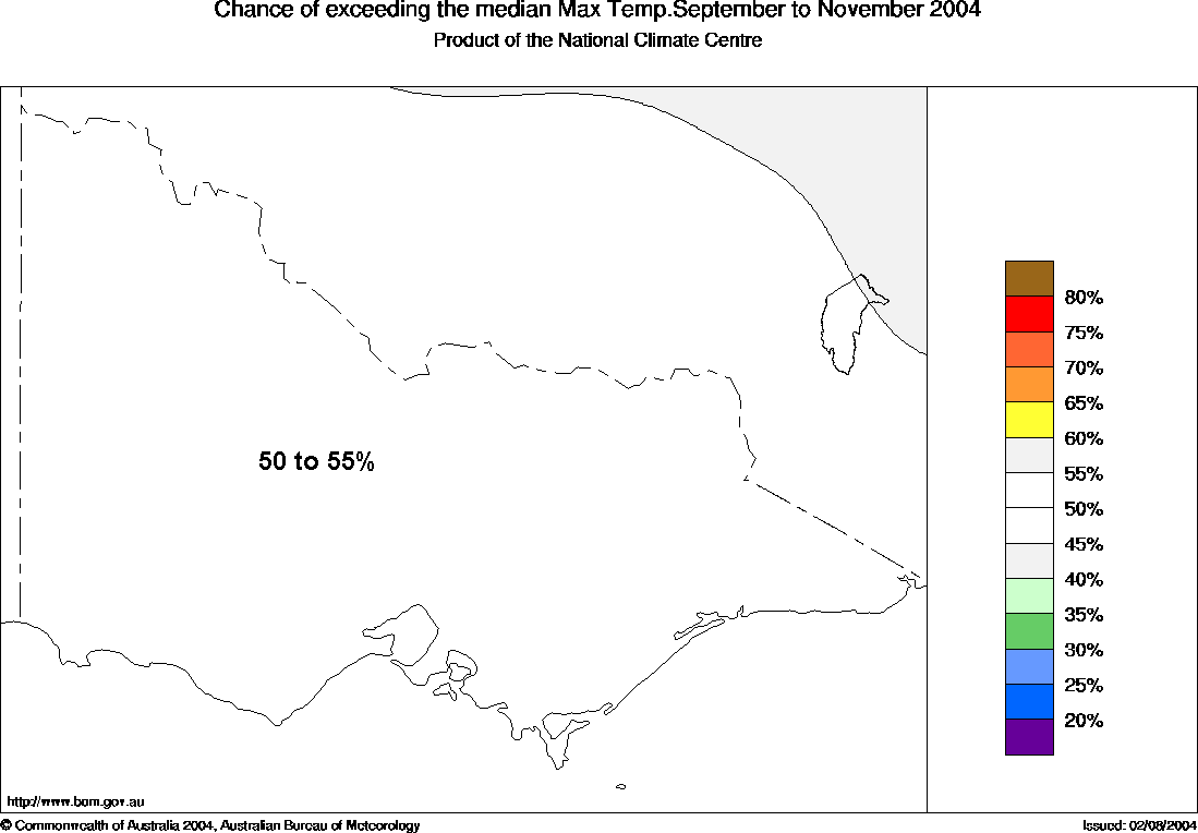The chances of above normal daytime temperatures averaged over spring are between 50