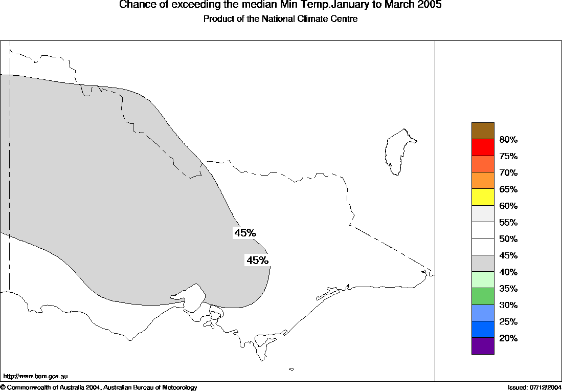 The chances of mean seasonal minimum temperatures being above normal are between 40