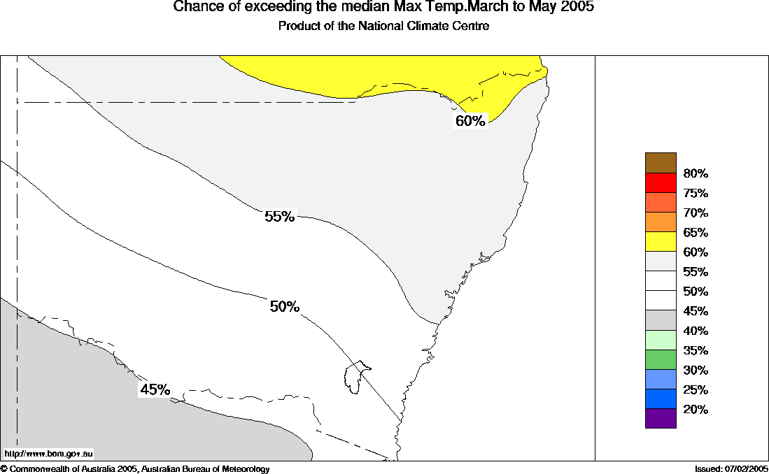 NSW Seasonal Temperature Outlook: probabilities for Autumn 2005, issued 17th February 2005 | ||||