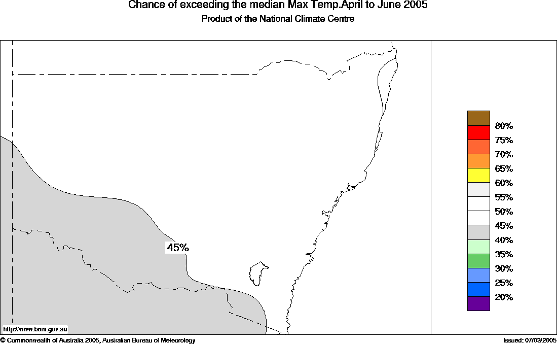 NSW Seasonal Temperature Outlook: probabilities for April to June 2005, issued 18th March 2005 | ||||