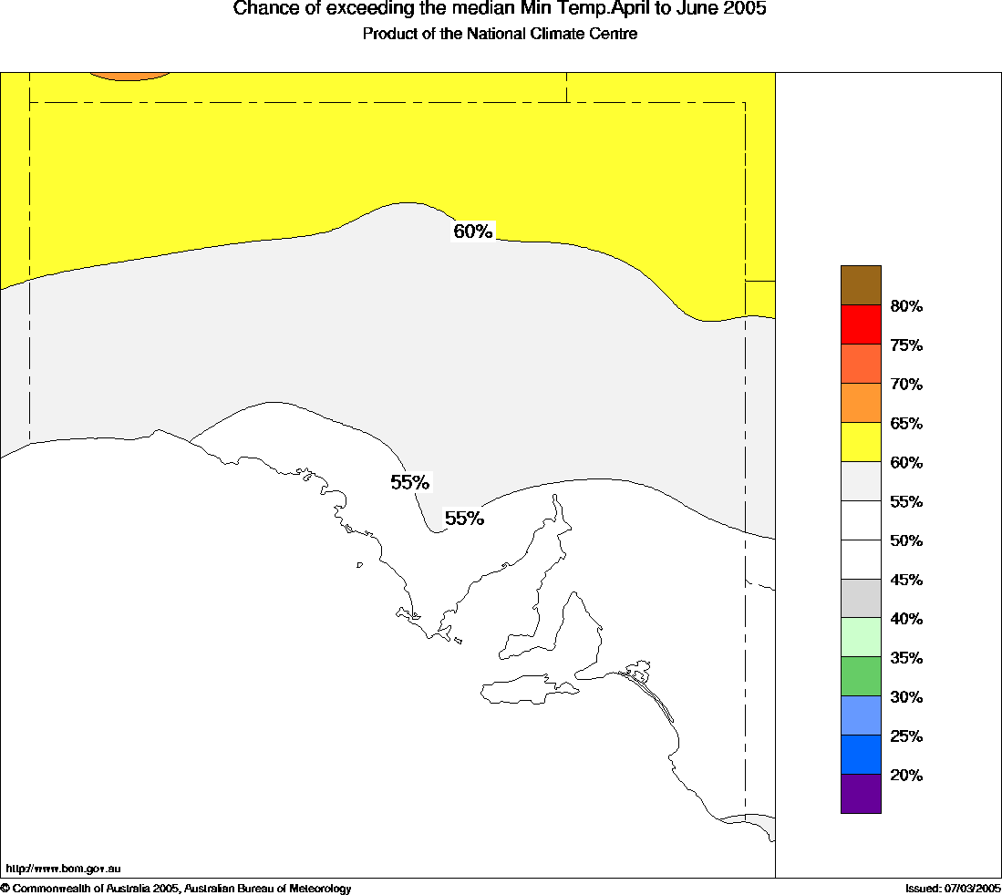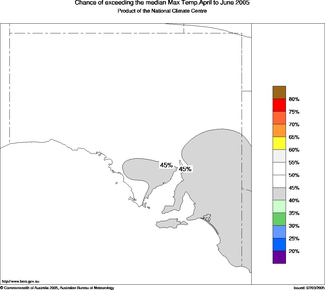SA Seasonal Temperature Outlook: probabilities for April to June 2005, issued 18th March 2005 | ||||