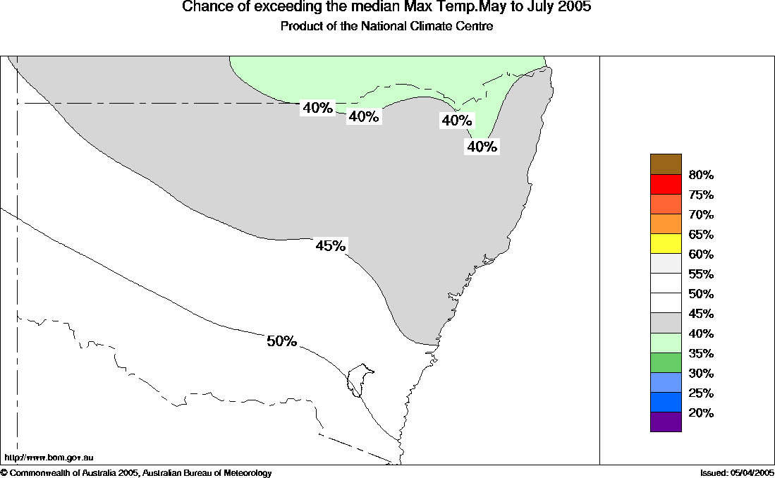 NSW Seasonal Temperature Outlook: probabilities for May to July 2005, issued 15th April 2005 | ||||