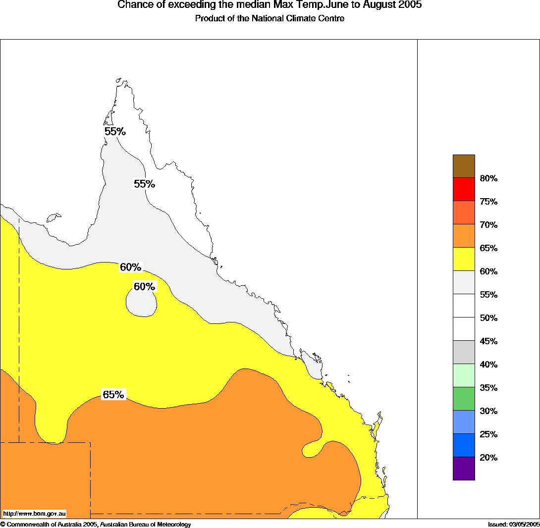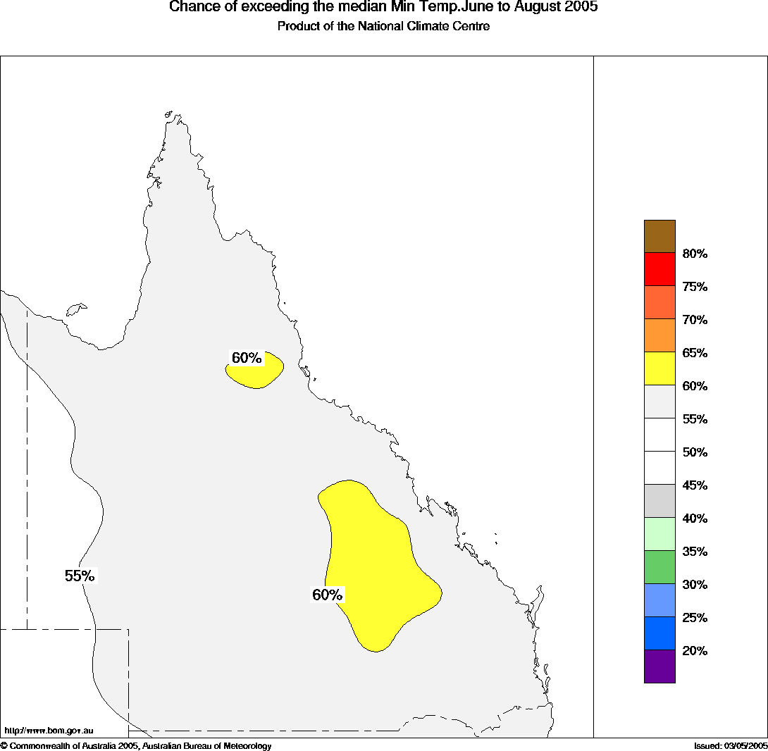 Qld Seasonal Temperature Outlook: probabilities for Winter 2005, issued 17th May 2005 | ||||
