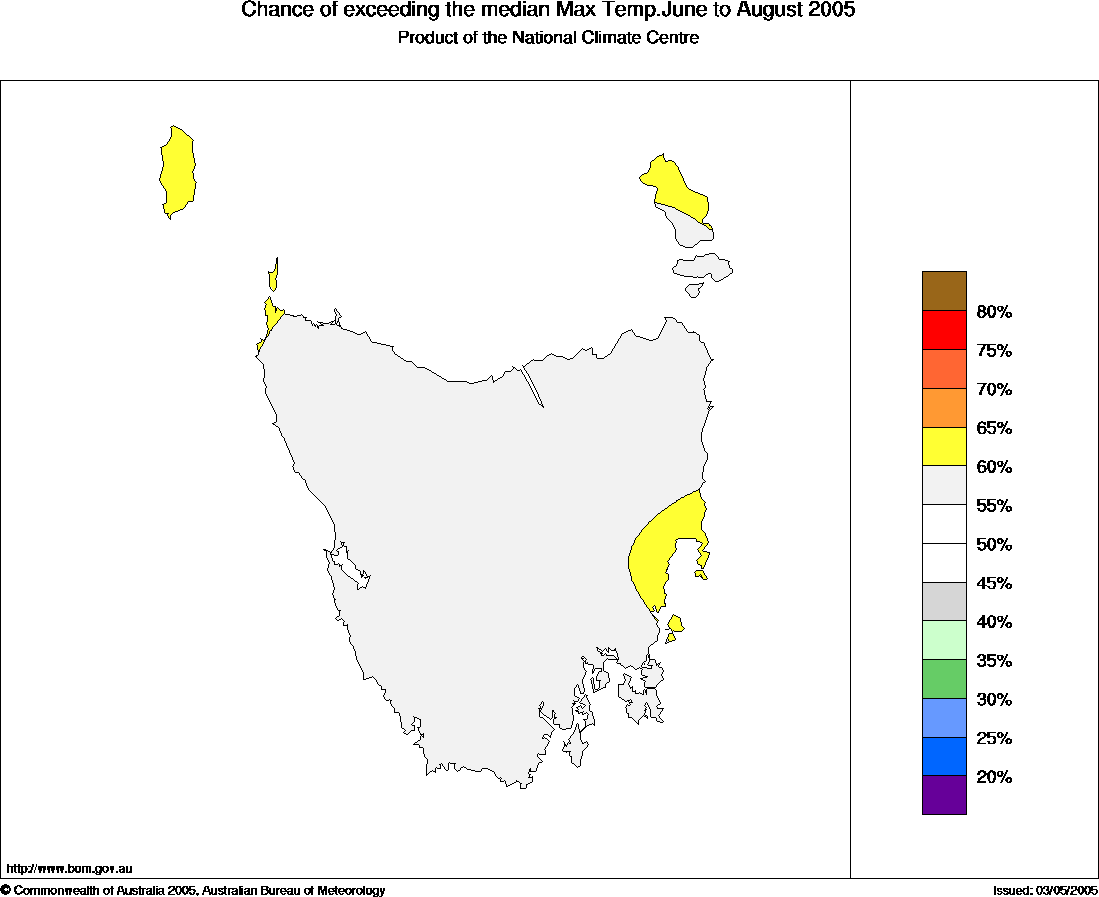 Tas Seasonal Temperature Outlook: probabilities for Winter 2005, issued 17th May 2005 | ||||