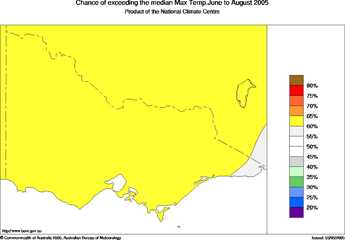 Vic Seasonal Temperature Outlook: probabilities for Winter 2005, issued 17th May 2005 | ||||