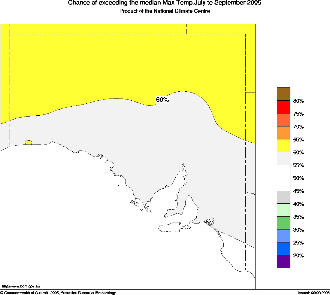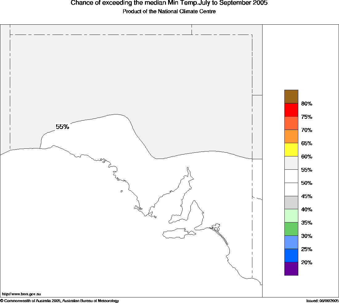 SA Seasonal Temperature Outlook: probabilities for July to September 2005, issued 17th June 2005 | ||||