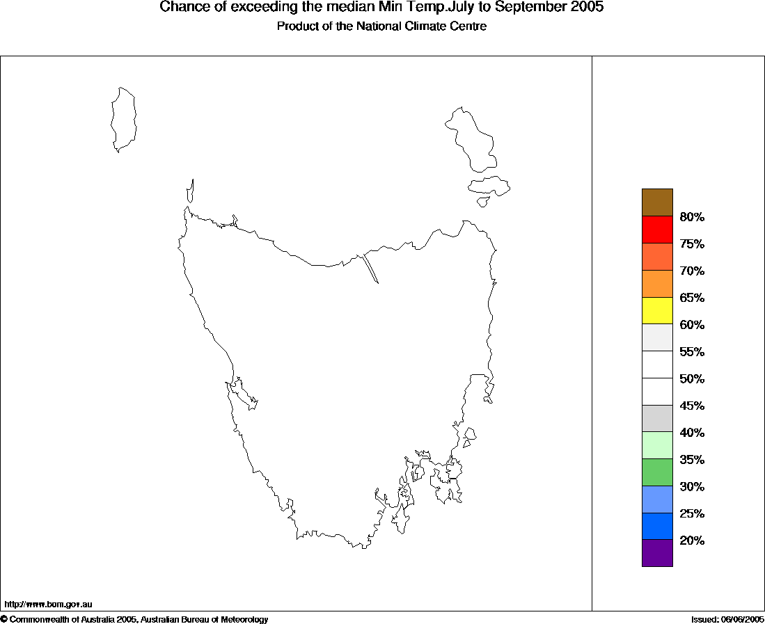 Tas Seasonal Temperature Outlook: probabilities for July to September 2005, issued 17th June 2005 | ||||