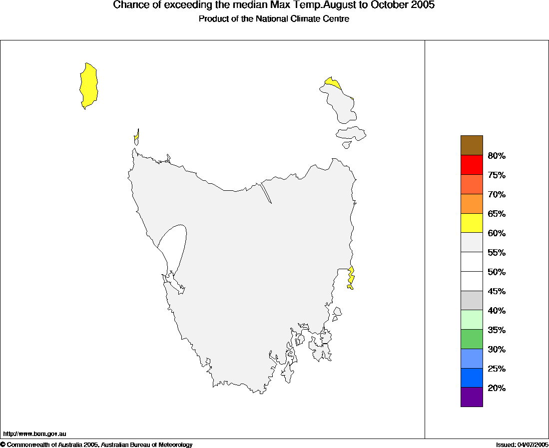 Tas Seasonal Temperature Outlook: probabilities for August to October 2005, issued 14th July 2005 | ||||