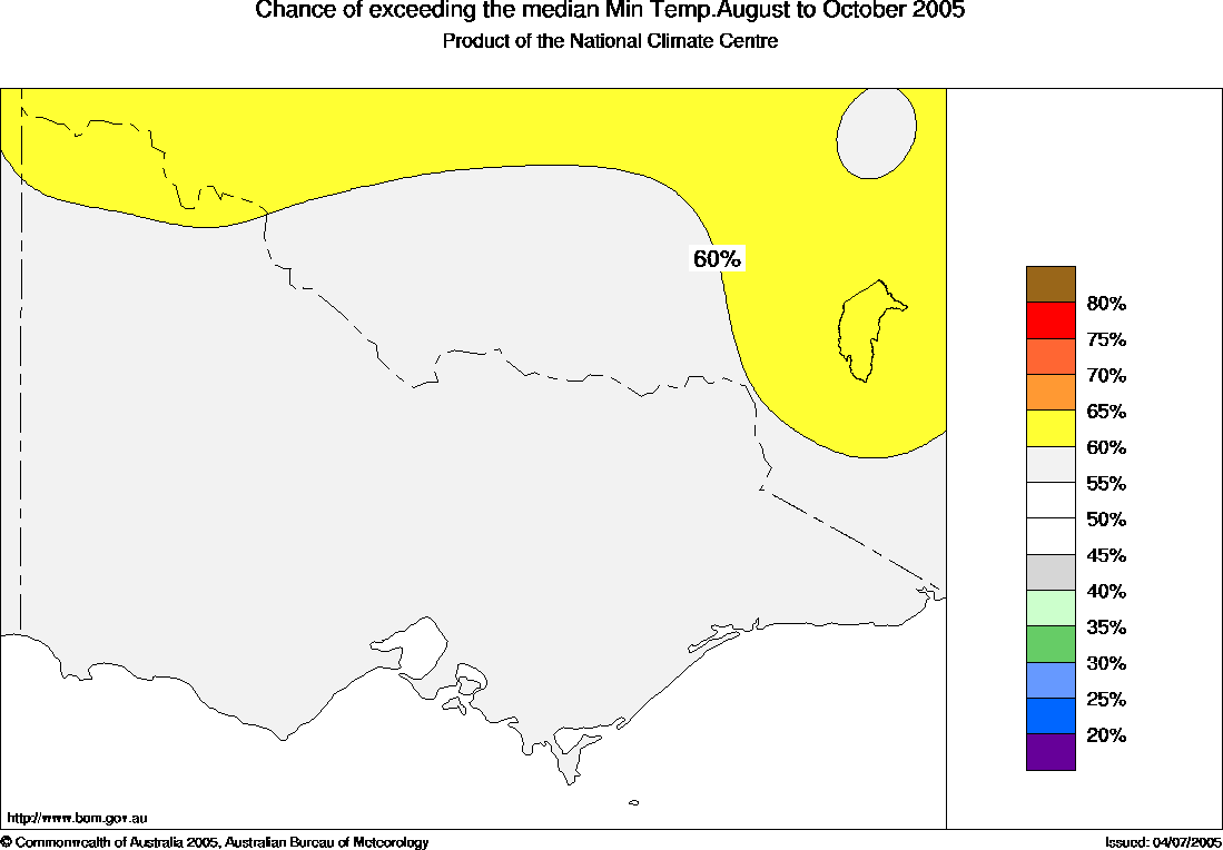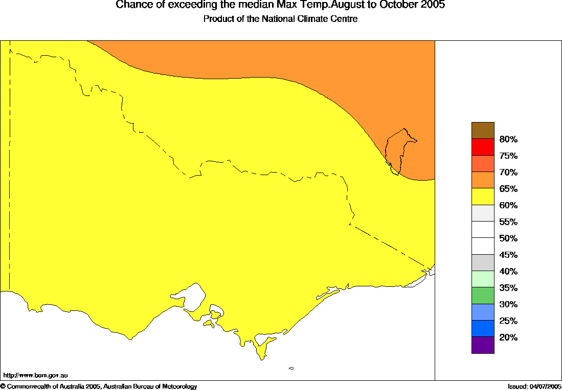 Vic Seasonal Temperature Outlook: probabilities for August to October 2005, issued 14th July 2005 | ||||