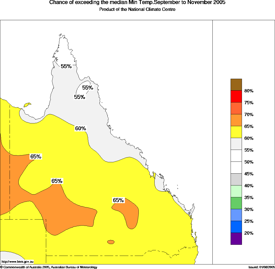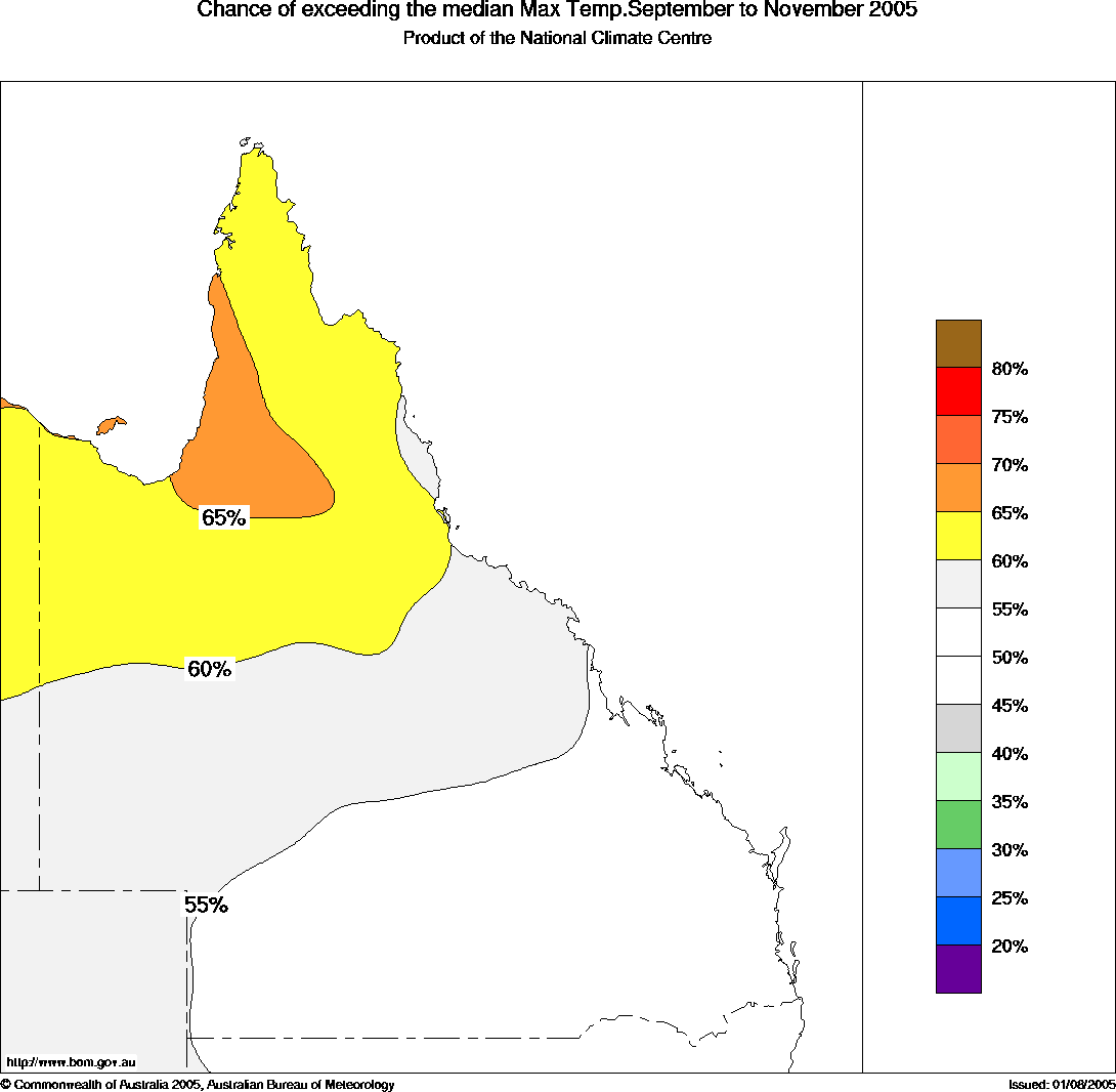 Qld Seasonal Temperature Outlook: probabilities for Spring 2005, issued 16th August 2005 | ||||
