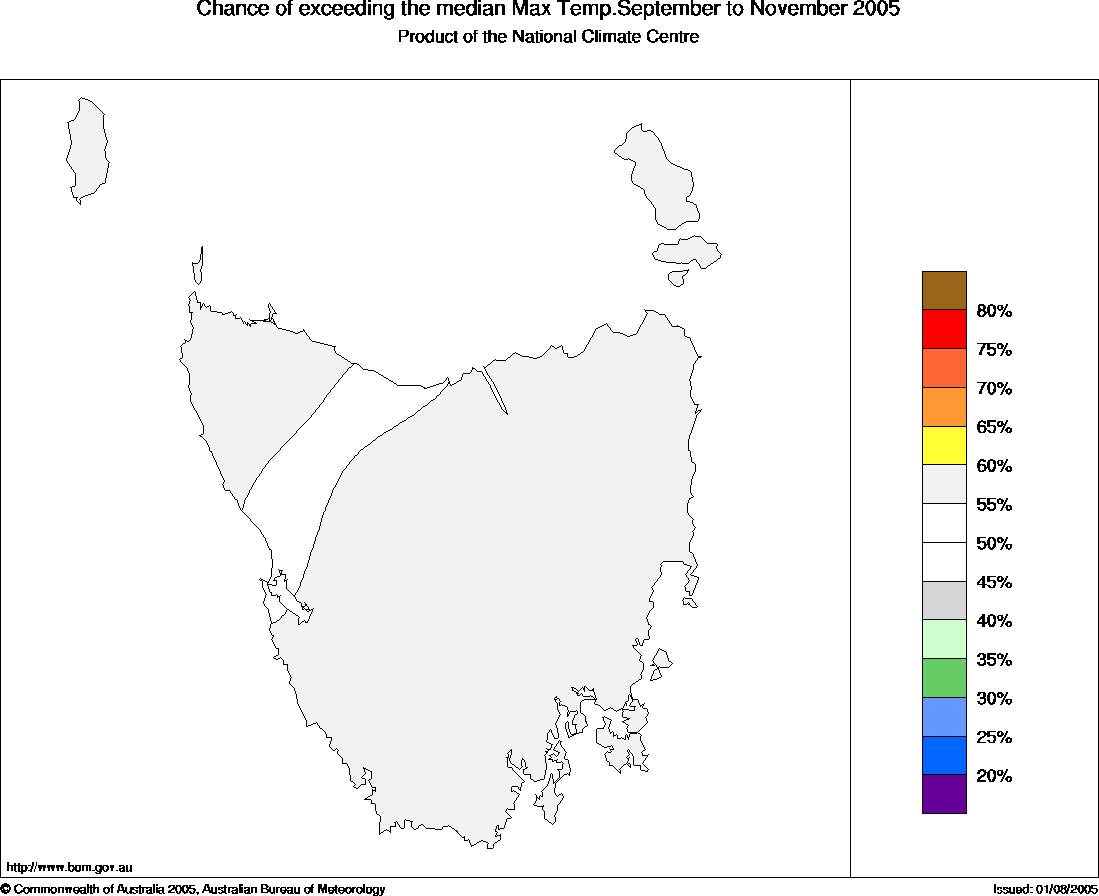 Odds 50:50 for a warmer than average spring in TasmaniaThere is an increased chance of above average spring (September to November) maximum temperatures over most of northern tropical Australia, the Bureau of Meteorology announced today. In Tasmania however, the are no strong shifts in the odds towards either a warmer or cooler than average spring.