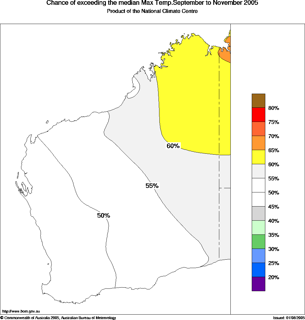 Above average spring temperatures for northern WAThere is an increased chance of above average spring (September to November) maximum temperatures over the far north of Western Australia, the Bureau of Meteorology announced today. Over the rest of the State, the odds of a warmer than average spring are close to 50:50.