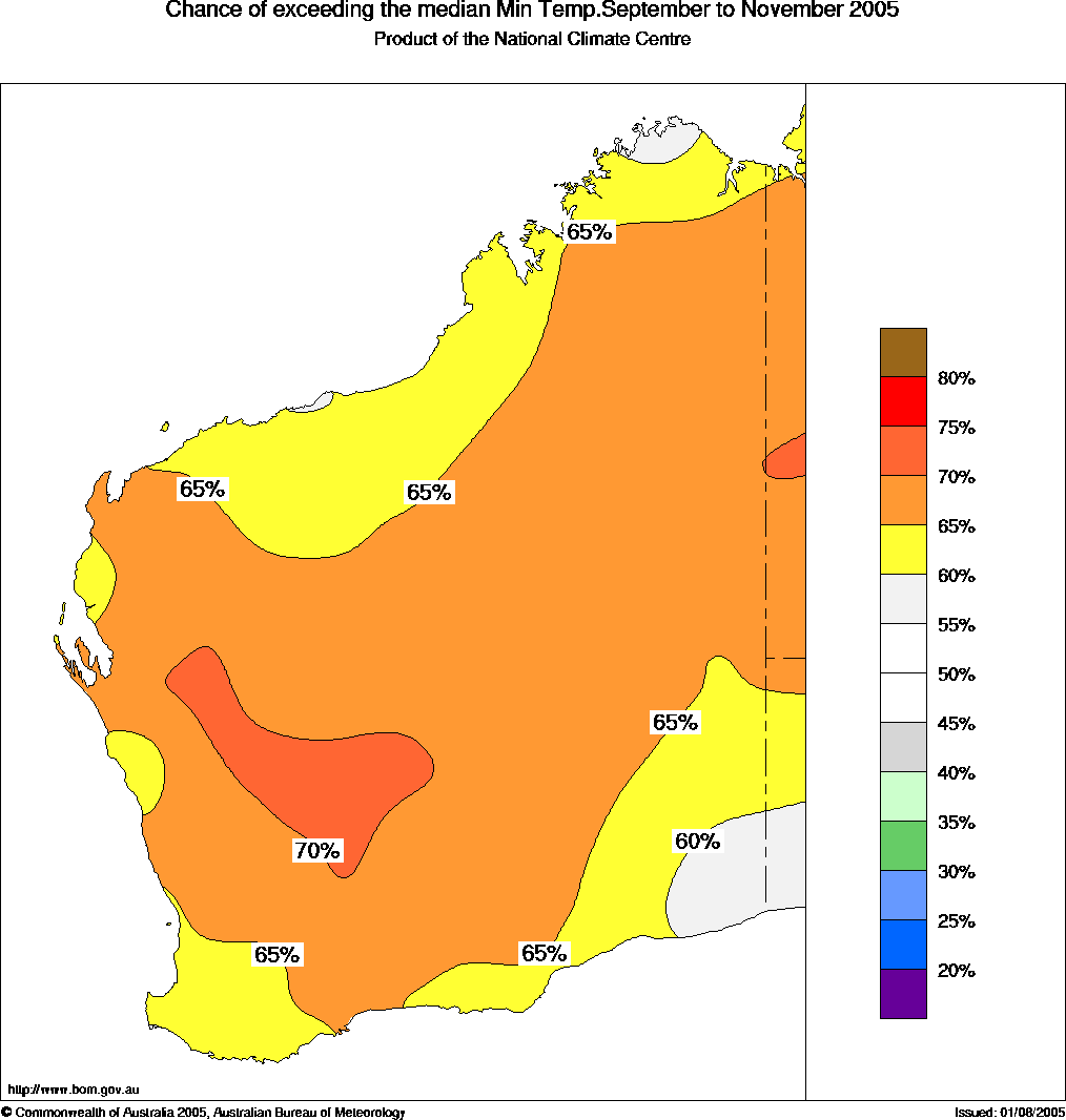 WA Seasonal Temperature Outlook: probabilities for Spring 2005, issued 16th August 2005 | ||||