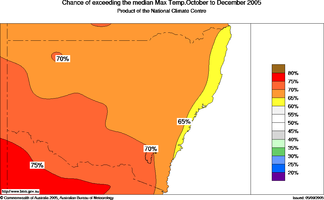 NSW Seasonal Temperature Outlook: probabilities for October to December 2005, issued 15th September 2005 | ||||