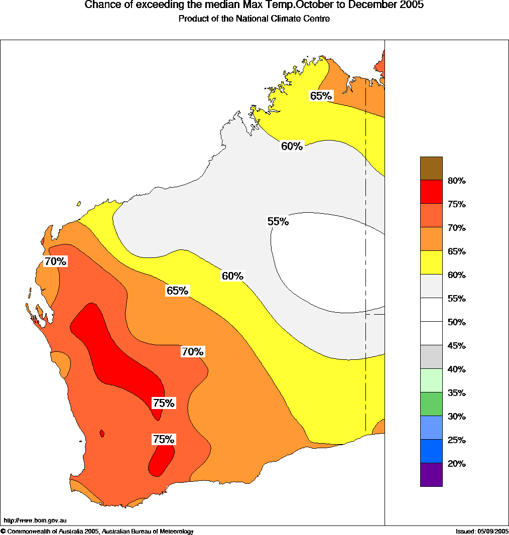 WA Seasonal Temperature Outlook: probabilities for October to December 2005, issued 15th September 2005 | ||||