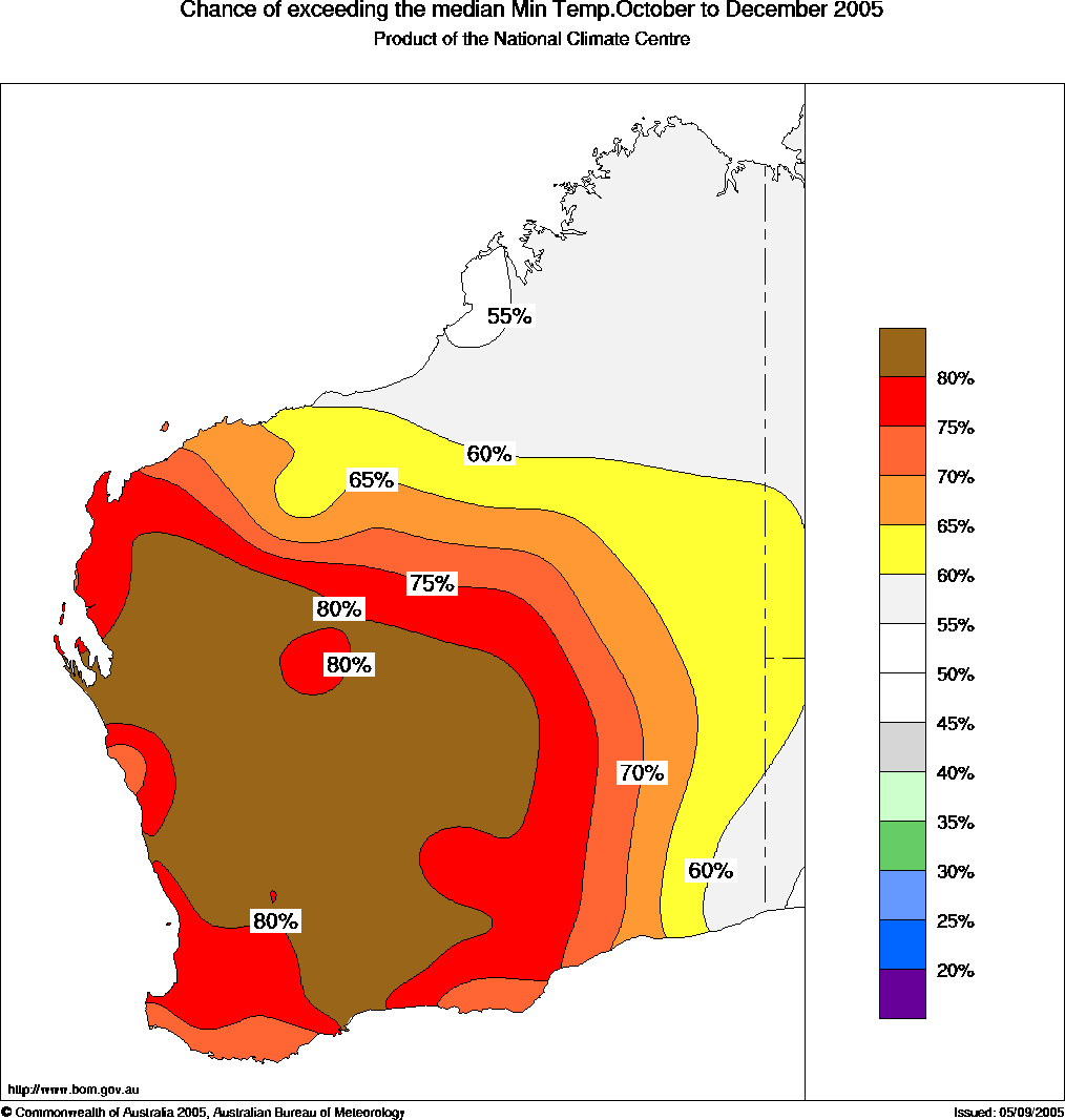 Warm end to 2005 in southern WAThere is a moderate to strong shift in the odds towards above average maximum and minimum temperatures across the southern half of WA for the December quarter (October to December), the Bureau of Meteorology announced today.