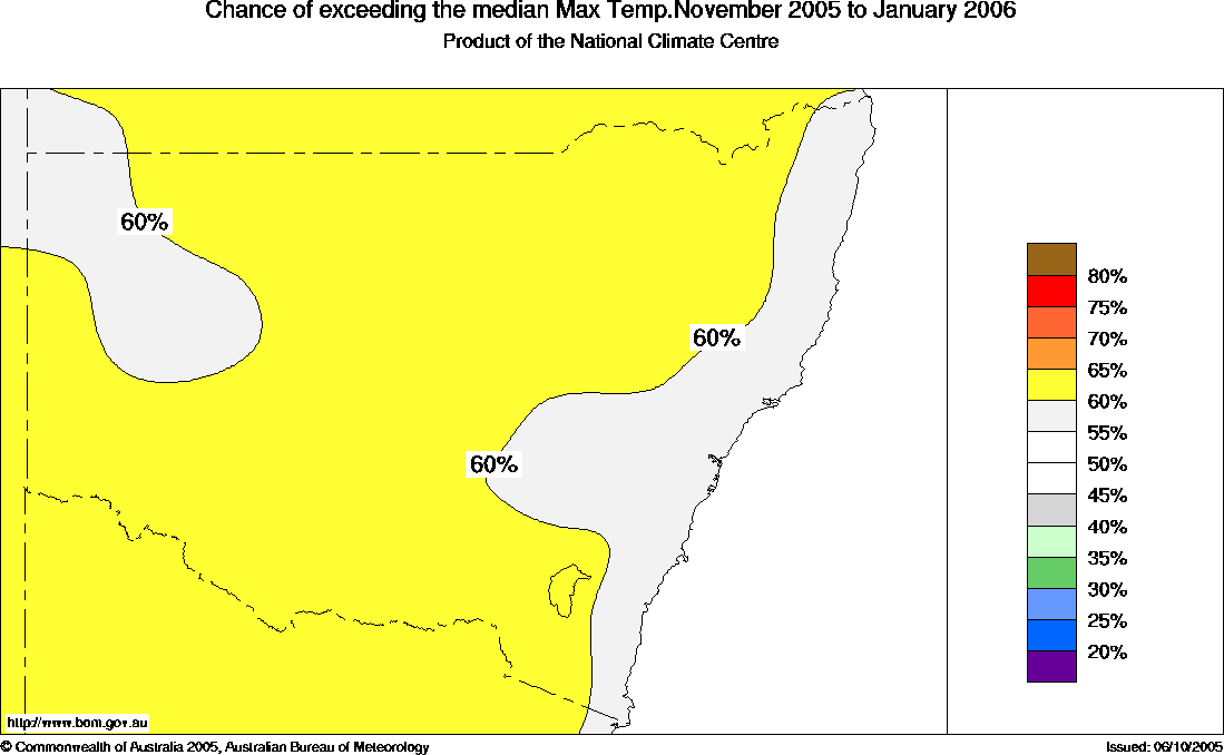 Warm start to summer for NSWThere is a moderate shift in the odds towards higher than average maximum temperatures for the late spring to mid-summer period (Nov-Jan) across much of New South Wales, the Bureau of Meteorology announced today. Furthermore, 2005 is set to be one of NSW's warmest years on record after the State-average maximum temperature for the January to September period was the third highest on record.