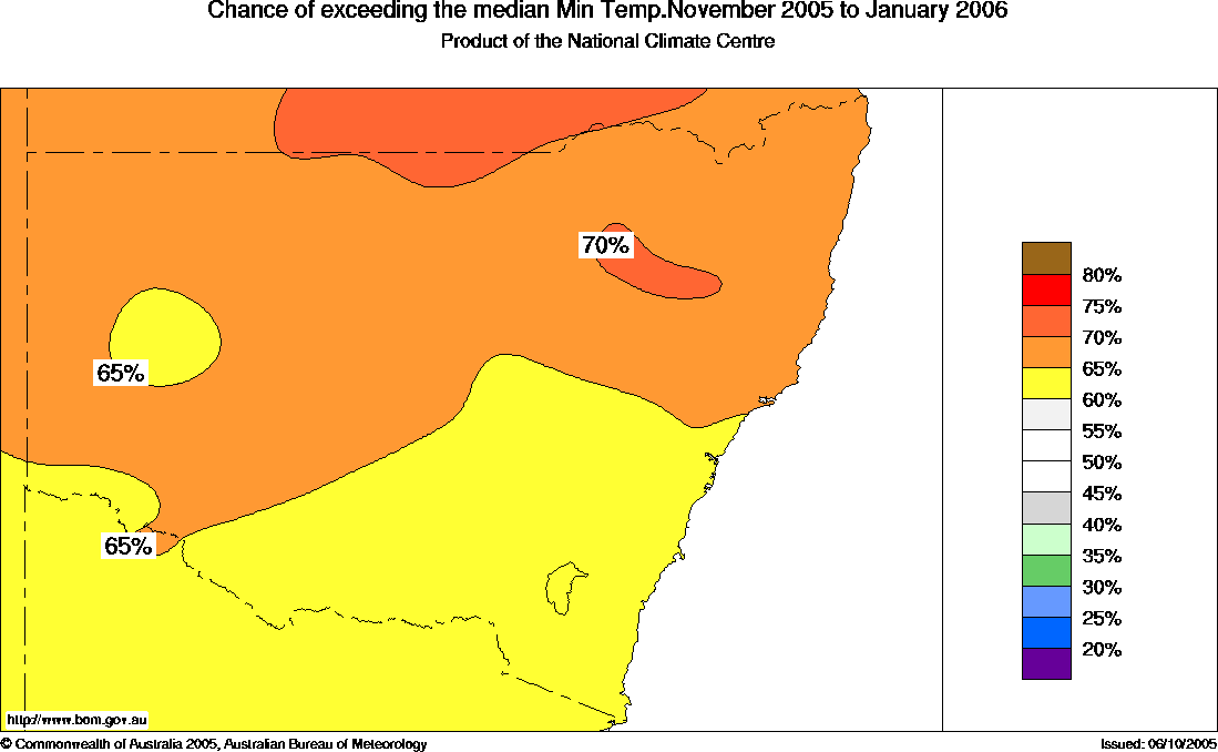 NSW Seasonal Temperature Outlook: probabilities for November 2005 to January 2006, issued 18th October 2005 | ||||