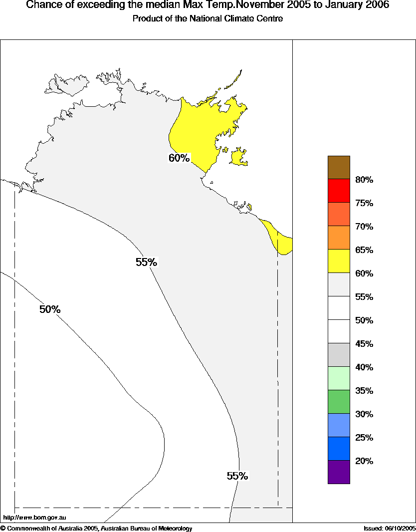 Generally neutral outlook for 3-month temperatures in NTThere are mainly weak shifts in the odds towards higher or lower than average maximum temperatures for the early to mid wet season period (Nov-Jan) across the Northern Territory, the Bureau of Meteorology announced today. However, 2005 is set to be one of the NT's warmest years on record after the area-average maximum temperature for the January to September period was clearly the highest on record.