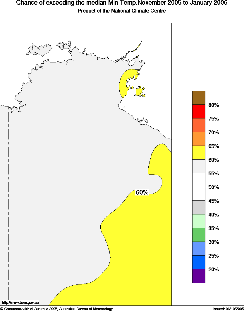 NT Seasonal Temperature Outlook: probabilities for November 2005 to January 2006, issued 18th October 2005 | ||||