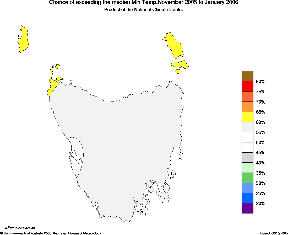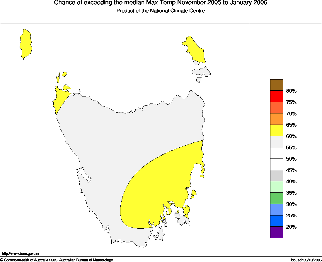 temperatures will be higher than the median is close to 60% over Tasmania, especially in