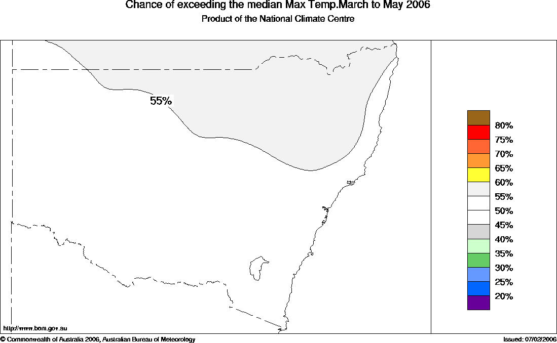 Neutral outlook for NSW autumn temperaturesThere is a moderate shift in the odds towards above median maximum temperatures for the March to May period in parts of Queensland and the NT surrounding the Gulf of Carpentaria, the Bureau of Meteorology announced today. However, over New South Wales the chances of exceeding the median maximum temperature for autumn are close to 50%.