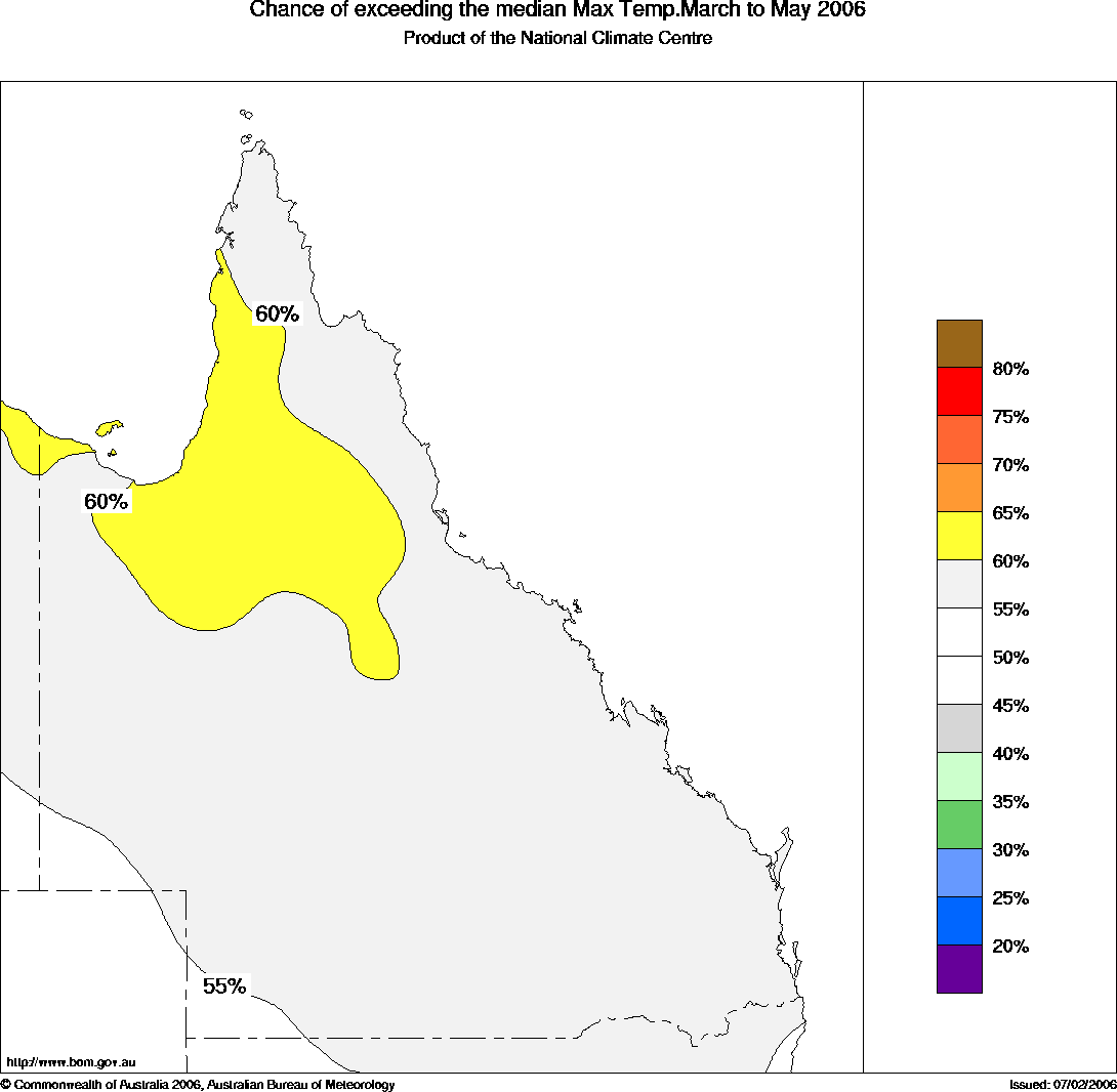 Increased seasonal temperatures for parts of Qld and NTThere is a moderate shift in the odds towards above median maximum temperatures for the March to May period in parts of Queensland and the NT surrounding the Gulf of Carpentaria, the Bureau of Meteorology announced today. However, over the rest of the State the chances of exceeding the median maximum temperature for the coming three months are close to 50%.