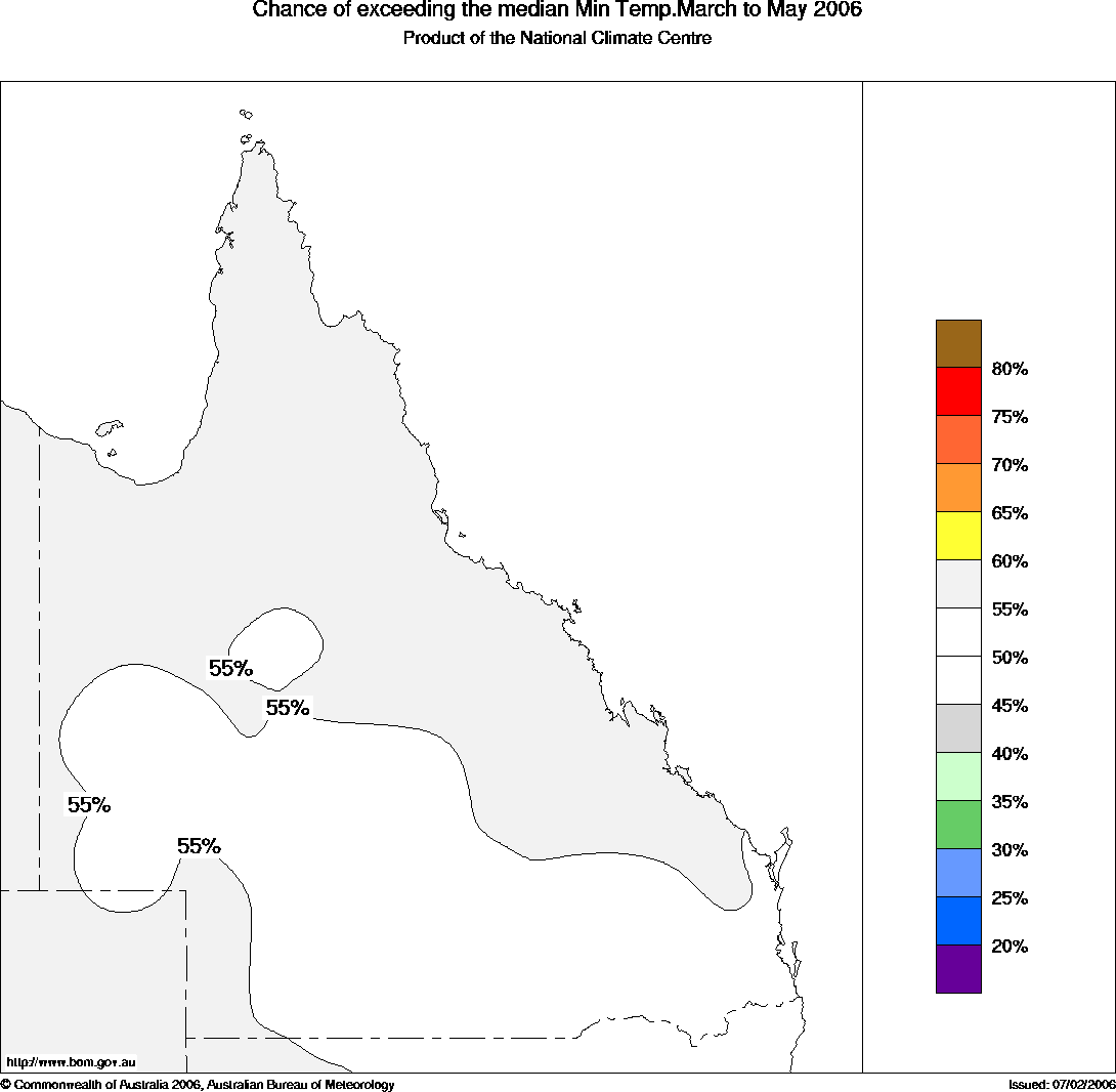 Qld Seasonal Temperature Outlook: probabilities for Autumn 2006, issued 21st February 2006 | ||||