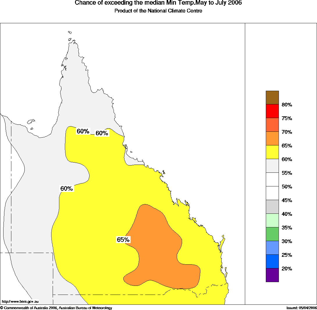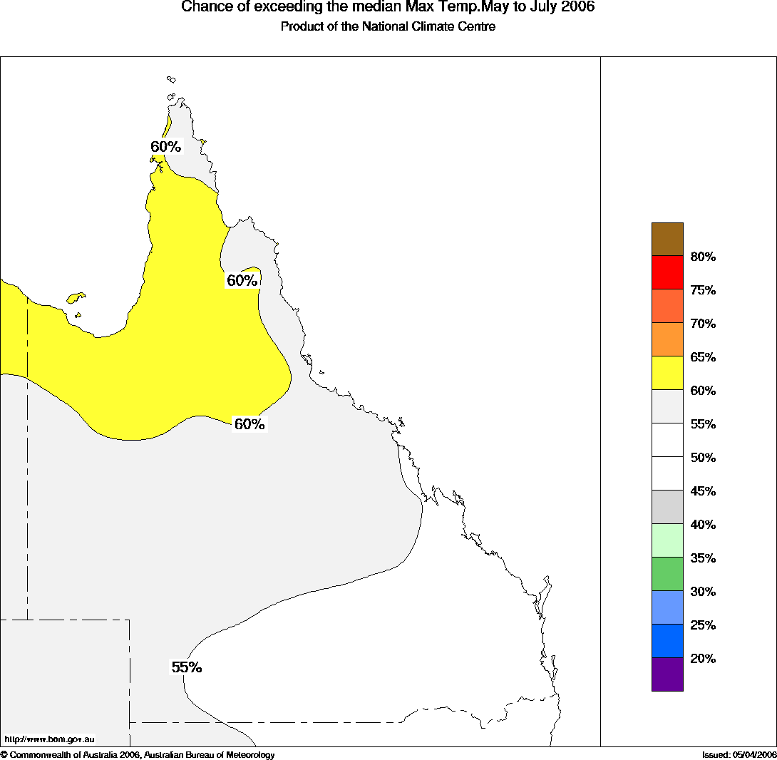 Qld Seasonal Temperature Outlook: probabilities for May to July 2006, issued 21st April 2006 | ||||