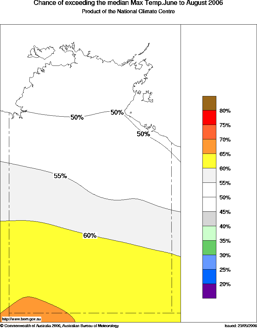 More information on this outlook is available from 9.00am to 5.00pm (CST) Monday to Friday by contacting the Climate and Consultancy section in the Bureau's Darwin Office: (08) 8920 3813. | ||||
