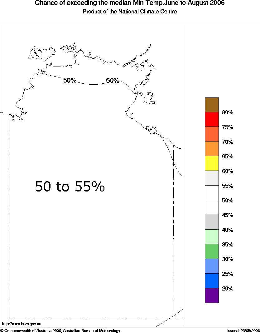 NT Seasonal Temperature Outlook: probabilities for Winter 2006, issued 25th May 2006 | ||||