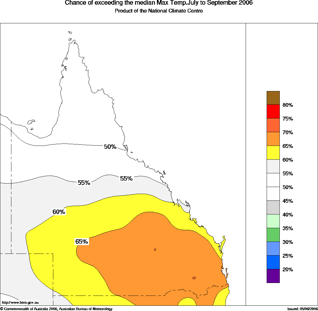 Above average temperatures favoured in southern QueenslandThere is a moderate shift in the odds towards above average maximum temperatures for the September quarter (July-September) across southern Queensland, the Bureau of Meteorology announced today.