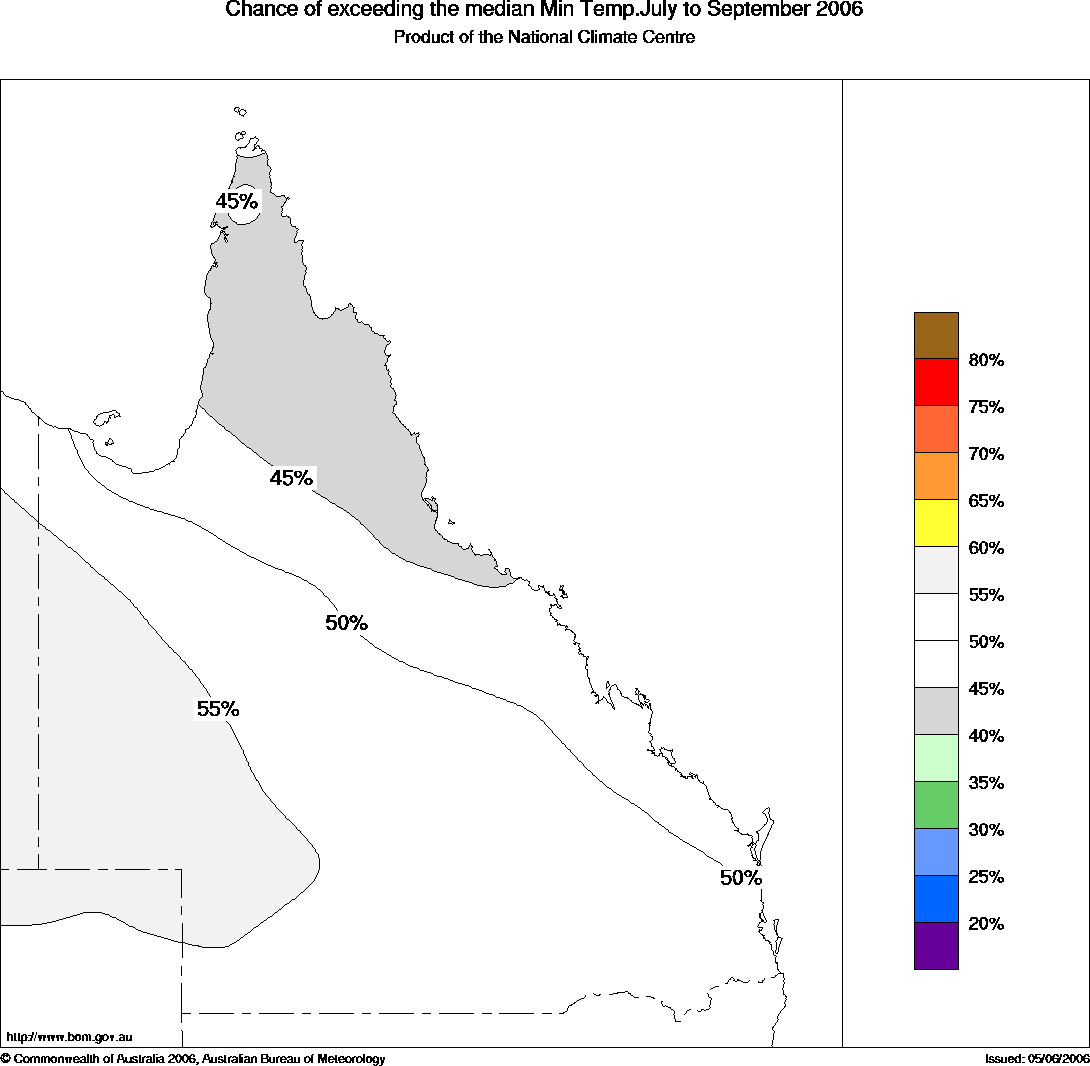 Qld Seasonal Temperature Outlook: probabilities for July to September 2006, issued 27th June 2006 | ||||