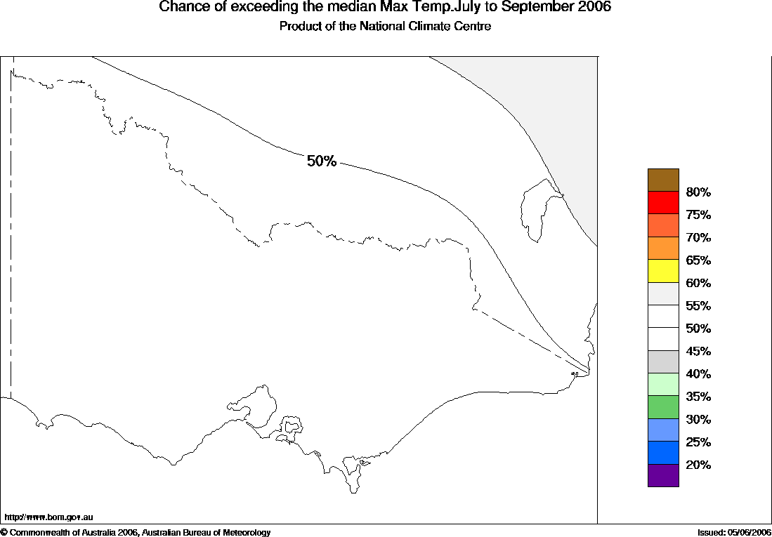 Vic Seasonal Temperature Outlook: probabilities for July to September 2006, issued 27th June 2006 | ||||