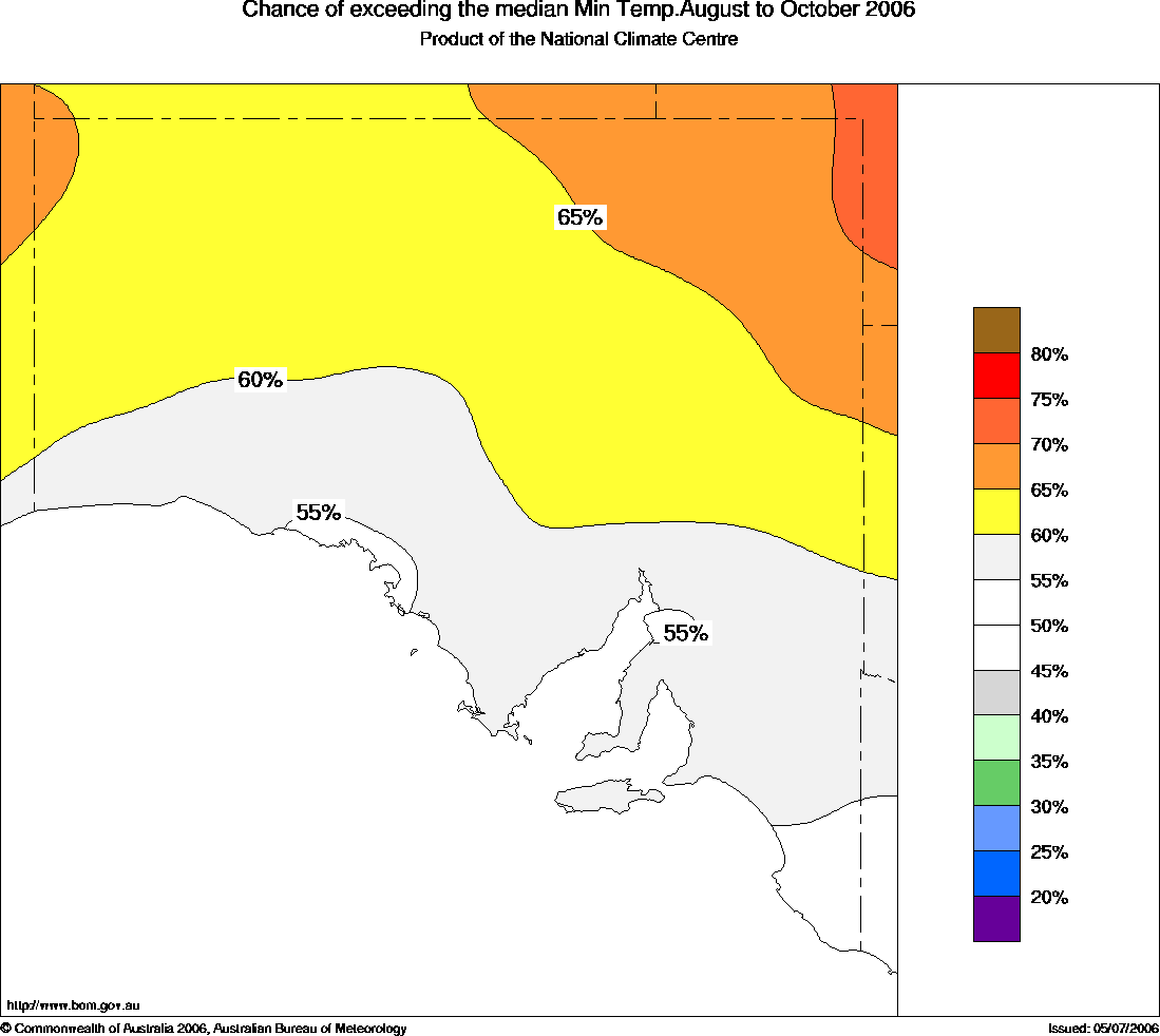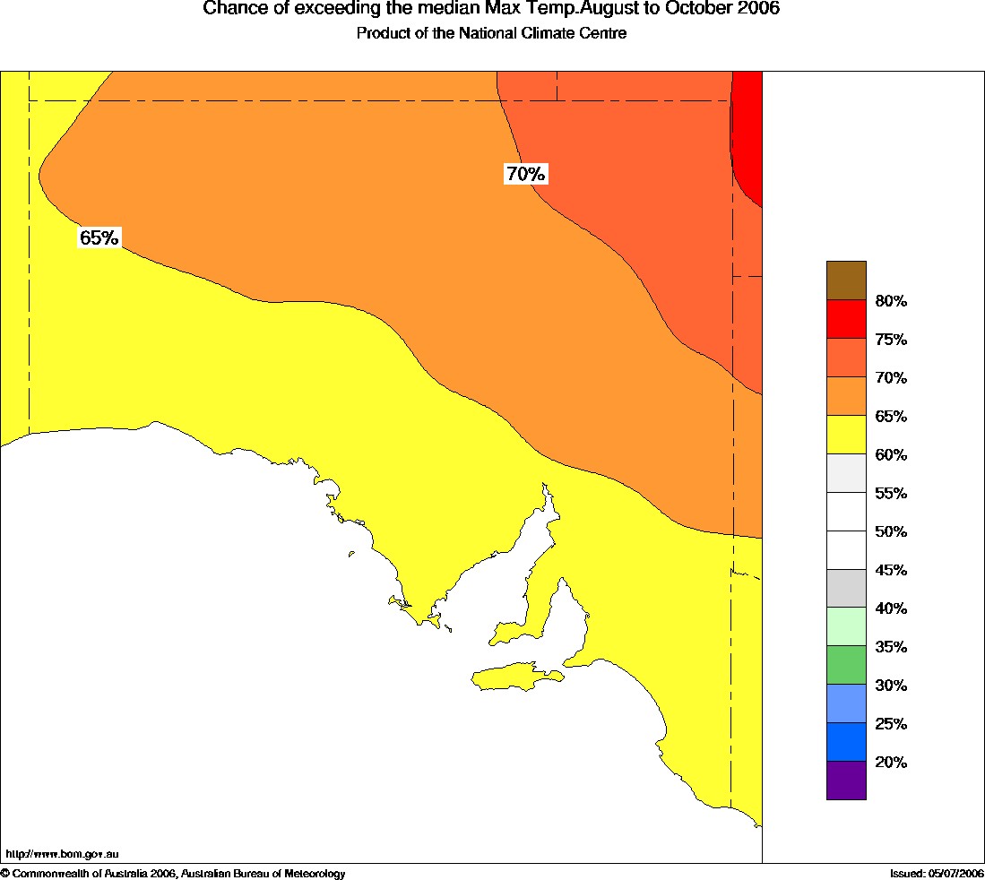 SA Seasonal Temperature Outlook: probabilities for August to October 2006, issued 25th July 2006 | ||||