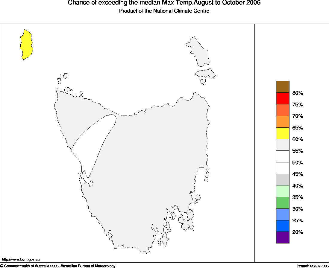 Tas Seasonal Temperature Outlook: probabilities for August to October 2006, issued 25th July 2006 | ||||